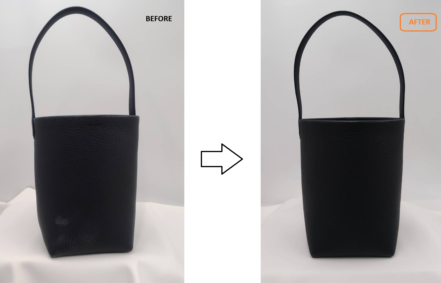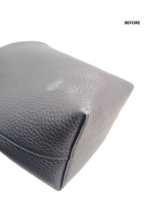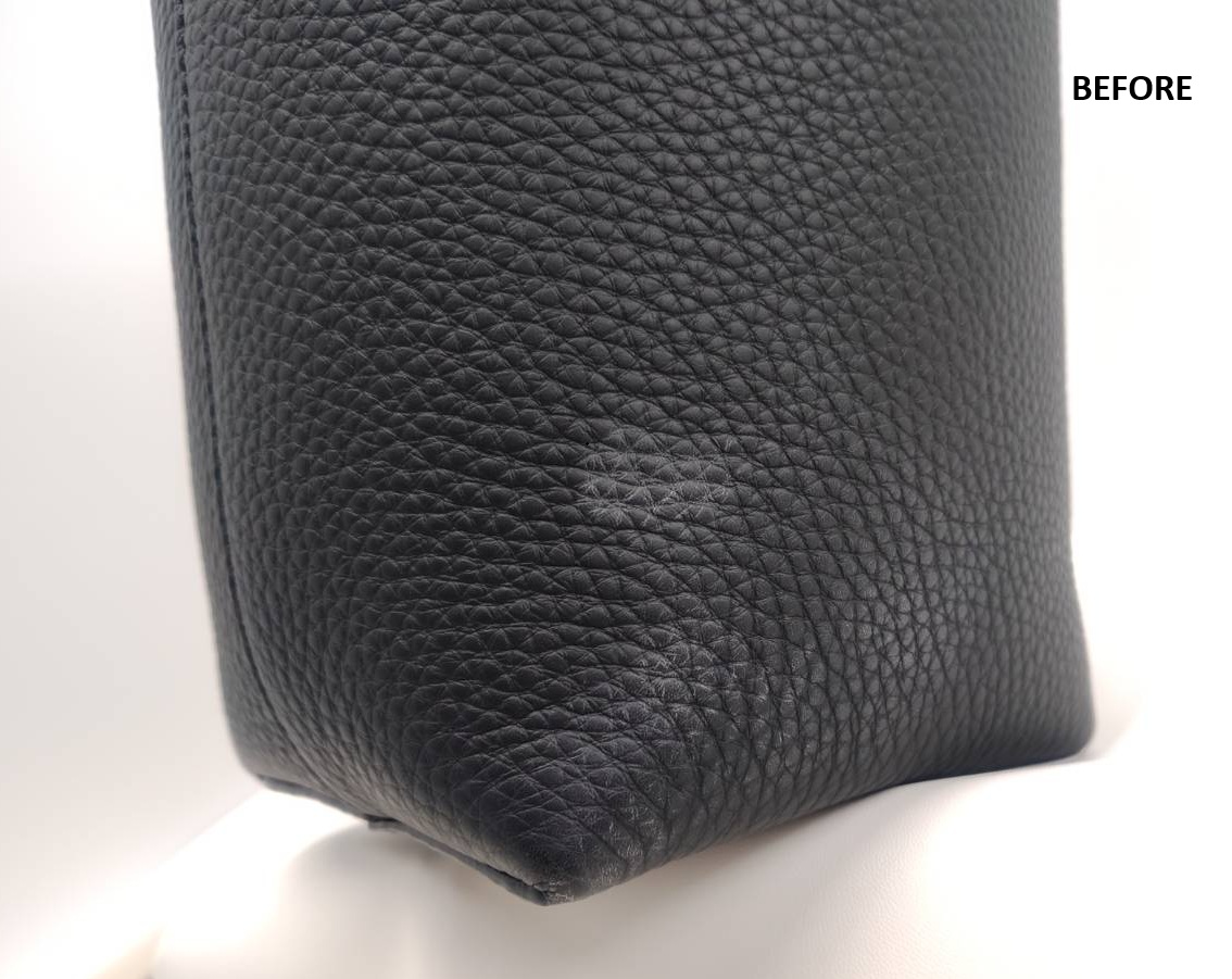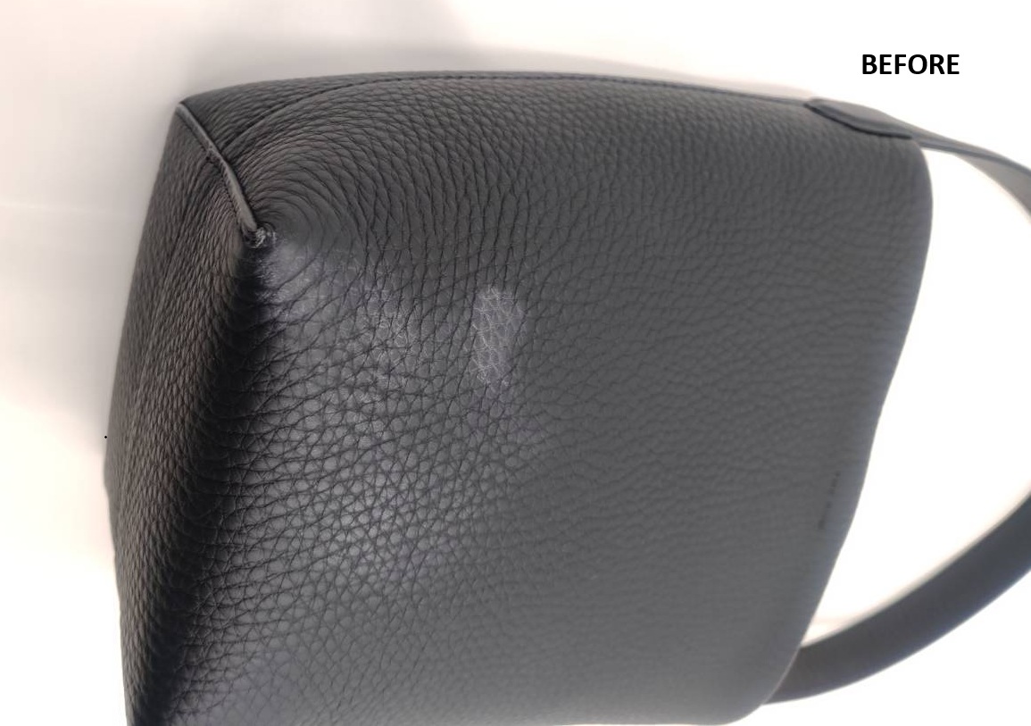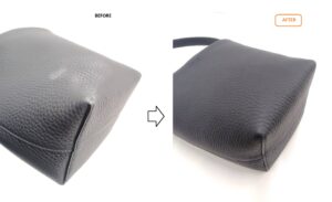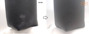 ご購入後まもなくスレ傷がついてしまい、黒いレザーの表面に白っぽい擦れが目立つ状態となっていました。部分的ではあるものの視認性が高く、見た目の印象に大きく影響していたため、部分補修のご依頼をいただきました。