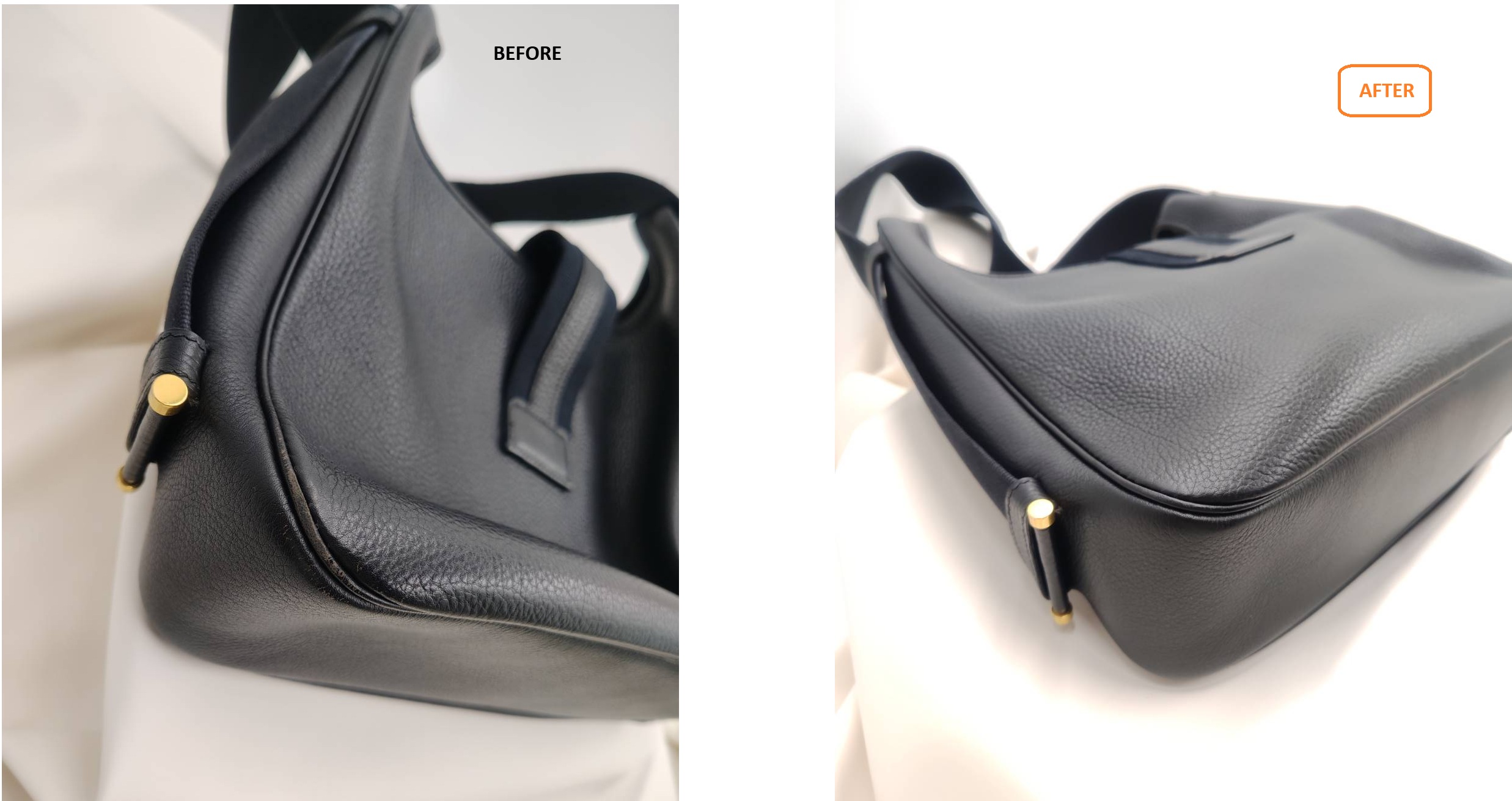 今回ご依頼いただいたのは、エルメスのバッグの角部分にできたスレ傷補修(部分染め直し)です。バッグの角は床や衣類との摩擦が多く、ダメージが集中しやすい箇所です。
